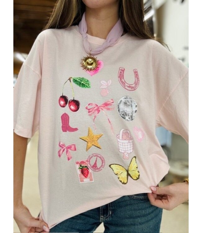 Featuring a curated collage of sweet and whimsical icons—cherries, bows, a disco ball, butterfly, horseshoe, cowboy boot, star, strawberry stamp, and more—this tee brings a fun, girly vibe with a hint of western flair.