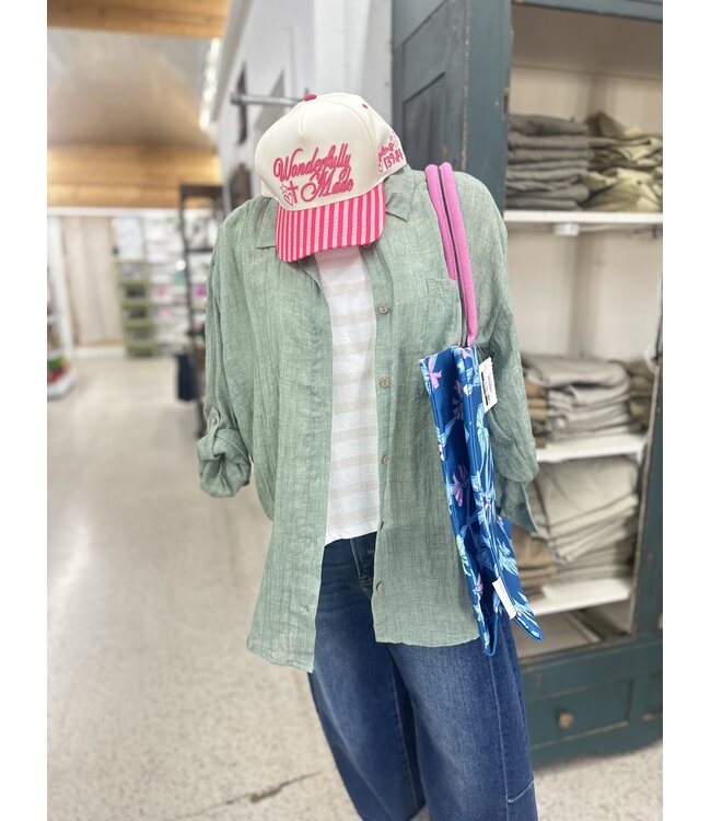 The relaxed silhouette drapes beautifully, while classic details like the button front and cuffed long sleeves keep the look timeless. The fresh green hue adds a pop of natural color that pairs perfectly with denim, white shorts, or layered over a tank for an easy, laid-back vibe.