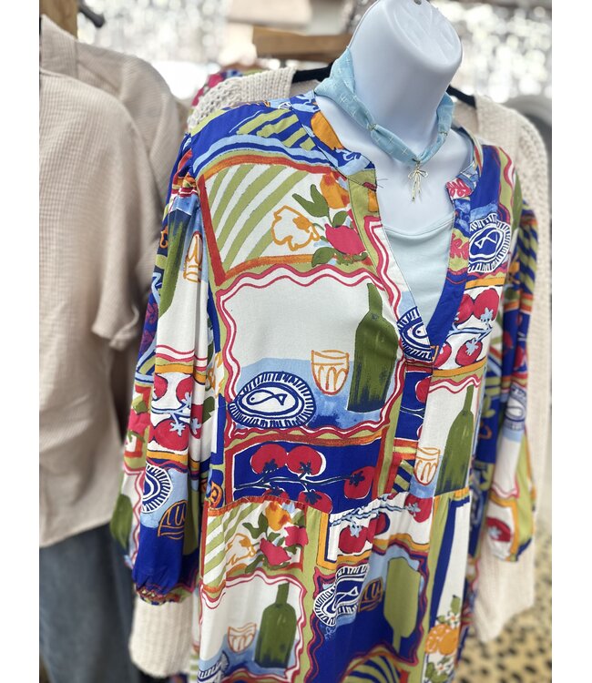 This maxi features a print of fun, bright fruit and vegis. They're an important food group and now this will be an important piece in your closet. Wear this alone, pair it with a cardigan or jacket...so fun and versatile.