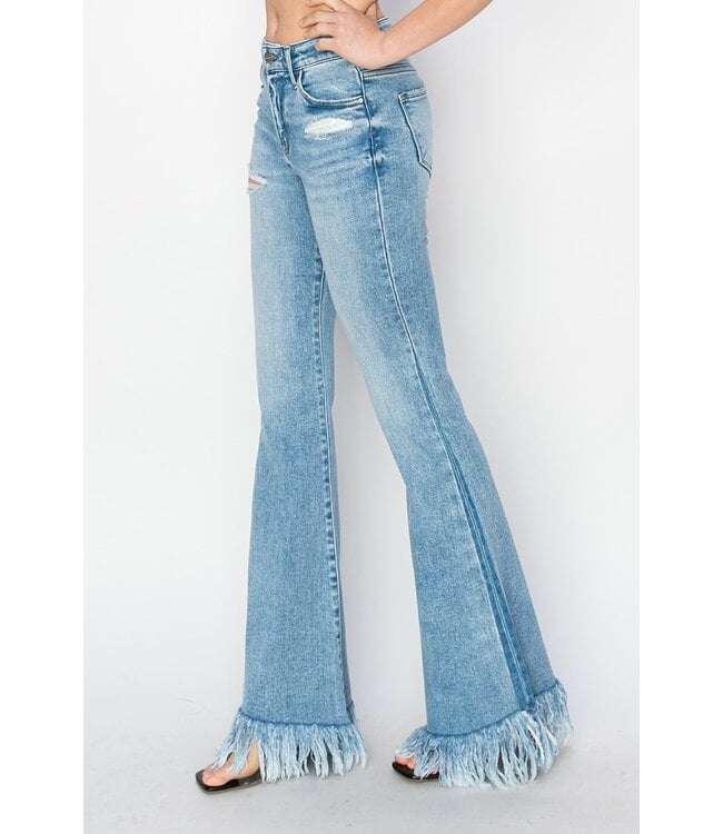 The standout feature? A dramatic frayed hem with long fringe detailing that adds movement and personality with every step. Finished with a classic five-pocket design, belt loops, and a button-zip closure, these jeans blend vintage vibes with modern flair.