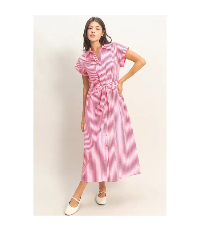 Designed with a crisp button-down front, collared neckline, and lightweight poplin fabric, it offers a structured yet comfortable feel. The adjustable belted waist creates a flattering silhouette, while the functional side pockets add a practical touch. The soft pink and white stripe pattern gives it a bright, timeless look that’s perfect for work, brunch, or weekend outings. Pair it with sandals or wedges for an easy, put-together style.