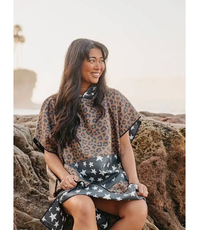 Designed for comfort, coverage, and confidence, this poncho is made from ultra-absorbent, quick-drying microfiber and features two designs in one for an easy style switch anytime. The relaxed, roomy fit makes it perfect for drying off, staying warm, and even changing in privacy — no slipping towels or scrambling to hold things in place. Just throw it on, get cozy, and go. Whether you’re oceanside, poolside, or post-shower, the crae. poncho is your new everyday adventure essential. This cheetah and stars print complement each other in the perfect way! Go in style to the pool and get compliments everywhere you go!